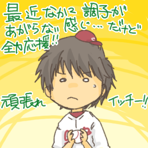 たまにはブログでも…。 いやぁ。あと一息!な試合が多くて、苦しい! 本当に1点差が多くてつらいです。 まぁ、勝っても勝たなくても試合は見ますが。 だって、どんなに調子よいチームでも 勝ってばっかりなんてないわけで、 観戦したい側としては、勝ち試合だけ見たいなんてないですしね。 そりゃ、勝つに越したことはないですが。。。 それにしても、イッチーが最近ボール打たれてしまうのがショックで…。 打球角度見た瞬間に「あぁぁぁぁぁぁ!!」って。。 別に調子が落ち込んでいるというのでもないんでしょうが、 大事な場面にマウンドに立つときは一発が効きますからね…。 ファンとしては、こうしろああしろは無いです。 ひたすら応援です!! 球場観戦記録用に作った分類ですが、 今回イラストで…。