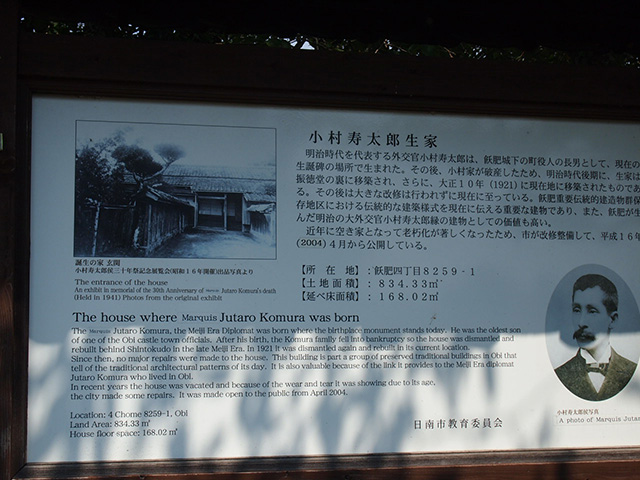 以前書いた東郷記念館を訪れた同日、宮崎は日南まで足を延ばし とうとう行ってまいりました!小村記念館!!!! ようやく、ようやく行ったよ~…! じゃーん!!!↓↓ 南国武家屋敷の香り、プンプンですwwww こちらが記念館本館!↑ 館内は写真撮影禁止です。なのでひたすらメモを取る用意。 私の個人的な収穫なんですが、小村一門の記念写真。 若佐分利がいるぅーーーーー!!! いやぁ、駆け出しから興奮しました…。 佐分利は小村の娘さんと結婚しているので、 写っている事は何ら違和感ないのですが、 絵として確認したのは初めてなのでテンションMAXでした。 あと、写しではありますが、パスポート。 特徴を書き記したもので、現在のものとはずいぶん異なる物ですが その内容・・・・。 眼…並 鼻…高い 口…小さい 面…長い 明確に描かれているのは身長くらいで156センチだそうです。 私よりは低いです。館内には等身大パネルがあるので、 小村と背比べができます☆ ちなみに。松岡もこの後に写真で登場。 飫肥に小村候生誕の地記念碑が昭和8年5月に建てられ、 翌月の6月に松岡が訪れているときの写真が。 そして、かつては満州に建てられていたという小村像。 その背記は松岡によるものだったらしい。 もちろんですが、日露戦争時の講和会議に使用されたテーブルのレプリカを はじめとした関連資料も展示があります。 さて、「小村記念館」なので小村関連の資料がいろいろと置かれています。 若き頃に使用したノートや教本。フロックコートなど…。 ……そう。外務大臣にもなった人なのに、勲章とか置かれてない!!! と思ったら発見!! しかしよく見たら、本多熊太郎のものでした。 関係性はあるけど、どうして本多…?と首をかしげていたら、 記念館の事務員(?)の方が「熱心ですね、研究か何かされているんですか?」と 声をかけて下さいました。 …趣味です、戦前外交官について個人的に調べているんです…。 いろいろと話をしている中で、本多の資料がなぜ 展示してあるのかについてうかがう事ができました。 ご存知の方も多いかと思いますが、小村の背後には常に借金が付きまとっています。 ゆえに現存している展示物も金目のものがほとんどない状態。 それをよく知っていた本多はいつも小村の状況を悲しんでいたようで、 記念館へ本多の遺族が、せめて代わりに…と本多の遺品を寄贈されたのだそうな。 本多自身ではなく遺族自ら。 どれだけ本多が家族に向けて小村に対する思いを語り続けていたのかがうかがえます。 そして、今でも年に一度遺族から記念館へ金一封が贈られるそうです。 ……泣ける。泣けるじゃないですか!本多先輩!!! (続く) ※・・・・※・・・・※・・・・※・・・・※・・・・※・・・・※ 拍手、ありがとうございましたvv