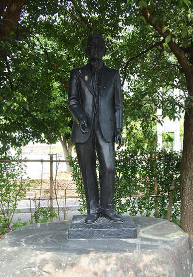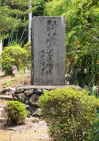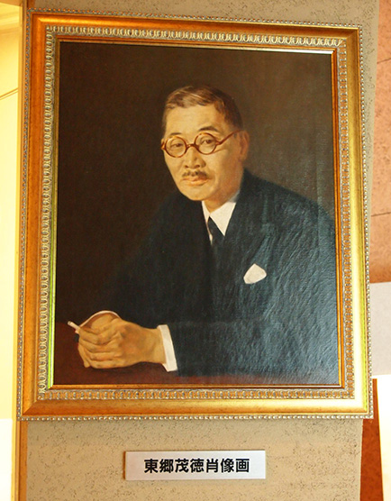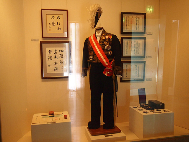 そ・の・ま・え・に。 受付でダメ元で「写真って駄目ですか?」と伺ったところ、 「少しならOKですよ」と嬉しいお言葉をいただき、 本来だったら撮影NGの館内を ずうずうしくも写真に撮らせていただきました! (入口の看板にNGと書かれています) 皆さまご来館時は、無断で撮影はご注意ください! たぶん、入って最初に目が合うのはこの肖像。 これ、東郷の死に絶望していたエディ夫人を慰めるため、 一周忌に、東京裁判の際 東郷の弁護を担当したブレイクニー弁護士が贈ったものだそうです。 …ええ話です。 そして、東郷のまなざしが…優しい…vvv 館内は複製も含みますが、ほかでは見られない東郷関連の展示が盛りだくさん。 代表的なものとして コレ☆↓↓ 中央は大礼服。右に勲章、左に東郷の号(青楓)の印。 壁かけられているのは右が外務大臣任命書や貴族院議員任命書。 左は自筆の書。すごく丁寧で美しい字。 展示物を中心に、パネル展示を通して東郷の生い立ちから晩年までを 年表で紹介しています。 そして約3分ほどですがスクリーンにビデオで東郷についての紹介映像付。 短めなんで、何度見ても…。あ、ちなみに自分で好きな時に再生できます。 ボタンをぽちっと押すだけ☆ 展示の一品ずつのメモをとりとり、展示物の文章を書き写ししてたら、 だいたい2時間くらい居座っていました。 面積としてはさほど広くはないのですが、私にとって、居座るには十分な内容。 その他の展示物としてざっと紹介しますと…。 ・外相時代の名刺・手鞄 ・日米交渉乙案草稿 ・愛読書 ・孫への手紙 etc. 東郷ファンにはきっとたまらない空間です。 展示コーナーを抜けるとテーブルなどが置かれているロビーのような空間。 実はこの建屋、公民館でもあるようで、東郷とはほとんど関係ないような 本がちょこっと置かれています。 簡単な集会でもするのかな?? ただ、このロビー(?)へ行くには東郷展示室を必ず通過するような構造になっているww 休憩とメモの整理にと椅子に腰かけふと顔を上げると、 古い新聞紙に美しい字でお習字しているものが目に留まり…。 よくよく見ると東郷の字!!!!! 「ナニコレ!」とばかりに必死に模写。 (私の影は気にしないで…。ちなみに中央の新聞記事内の写真は 東郷元帥。) 後で受付に聞くと習字の練習に 新聞に書いていたものがあったので展示してるとの事。 …なんて庶民的な…!!! 館を出て、しばらく歩いたところに広場があり、 そこを少し過ぎたところに、東郷茂徳の像があります。 少し不思議なポーズですが…。 相変わらず木陰で涼しそう。 いや、さすがに今年は暑いか? 場所が鹿児島市内ではないため、訪れにくいと言えばそうですが、 鹿児島本線で東市来駅で下車するか、レンタカーで美山ICを降りるかです。 個人的にはレンタカーおススメ。 駐車場もありますので☆ 8月14日。鹿児島県にある東郷茂徳記念館に行ってまいりました。