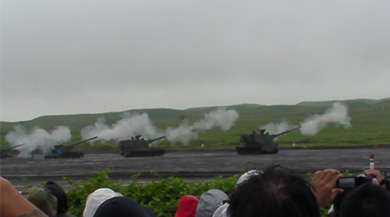 25日は御殿場の富士演習場まで行ってきましたー。 今回はいろいろとあって、チケットを複数入手できたため、 旦那と旦那友達とソラさんとマツリさんで。 …当日顔合わせな感じで、発案者としては非常に申し訳ない感じ(滅) 早朝 新横浜を出発し、車で御殿場まで。 駐屯地駐車場からシャトルバスで現場へ向かい、 到着は7時ごろだったのですが…。 ひな壇席はすでに行列。順番待ちではあるものの、 座れない可能性があるとの事で、泣く泣く断念しシート席へ。 幸い(?)一列目シートに座れたので、比較的見える範囲ではありました。 が。 それよりも先に天候。雨なんです。しかも気温20度。 寒い!!!!!!!! 傘は禁止のため合羽来て待ちました。 ひたすらに耐える時間約3時間。 開始は10時からなのですが、多分開始時刻に合わせて動くと この演習をまともに見る事は出来ない。 人が…人が凄いから!!!! 今年はネット抽選だけでも20倍とかって聞いたので…たぶん これまでの熱気を超える勢いだったのかと。 しかも雨なのにこの人・人・人!!!! 某アニメの影響と社内では話をしていたが…。まさかここまで…。 雨があまりにもひどかったので、 マイカメラでの写真は断念しました。 防水ビデオカメラでとりあえずお目当てをパシャパシャ。 たぶん右から99HSP(2台),203HSP,FH70 FH70意図的にフレームアウトさせているwww 聞いた話では火薬を減らしてやっているのでこんな感じだとか。 席からすっごく遠くにいたAW。 弾道がきれいに見える。 でも天候が天候なんでこんな感じに映ってます。 そして今回最大のお目当て! 10式戦車ー☆ 動きがスマートでぺったんこで早い! 出てきた途端に撃ってきたので思わず 「そこで撃つんかい!」と突っ込みいれつつ撮影したのがこれ。 直後、衝撃波負けしてます。私。(笑) もう一枚10式。 カメラで撮りたかったなー。マイカメラ。 今日は職場で一日を語りつくしましたが、 予行でよければ来年行けたらいいねと言っていただきました。 ホント、きちんとカメラにおさめたかった…!! でも生10式見れて本当に良かった!! ざっくりレポでゴメンナサイ☆ 映像、下記から見れるよー。 http://www.youtube.com/watch?v=DvaCh0cRnDc&feature=c4-overview-vl&list=PL1LEgzQHG9LwZq-9aEB-FOBfi6G_WcikL ※・・・・※・・・・※・・・・※・・・・※・・・・※・・・・※ 拍手、ありがとうございましたvv さて、入館券を購入し、中へ!!