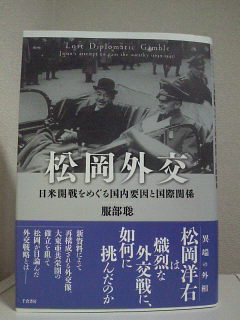 ふらっと立ち寄った行きつけの本屋さんで発見!! 詳細→http://www.chikura.co.jp/ISBN978-4-8051-1007-2.html 見つけたとき、思わず悲鳴を上げました・・・。 近年東京裁判史観脱却に関する本も増え、 いつかこういう日の目を浴びるような日が来るんじゃないかと思っていましたが・・・。 松岡外交は関連書などが少なくて頼るところが限られていたので、 即・買いでした。(完全に衝動買) おかげでほかに買う目的だったもの買えなかったよー。でも許すー。 行きつけの本屋さんに最近少しずつ外交関係の本が増えていたので、 あてなく見ていて、「中曽根」本を手に取ろうとしたらすぐそばにこの本があって、 そのままそちらに手が伸びました。 結局「中曽根」本読まなかったー。 さらにその隣には「日本外交文書 日独伊三国同盟・日ソ中立条約編」も。 さすがに手持ち予算完全にオーバーしてたので、それは見過ごしましたが、 この並び、ちゃんと意図してくれて店員さんが並べてくれたのかな・・・。vvv もっと、もっと出て!!松岡関連書!!!(切望) 今日は一日この表紙見て過ごします。 超スマイル松岡。 昨日は午前中に「劇場版 青エク」見て、